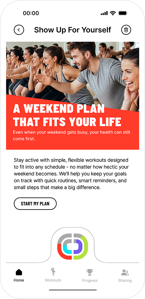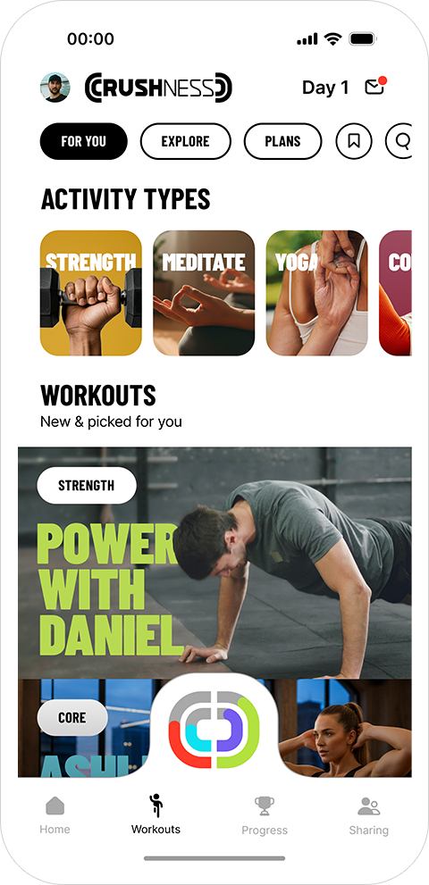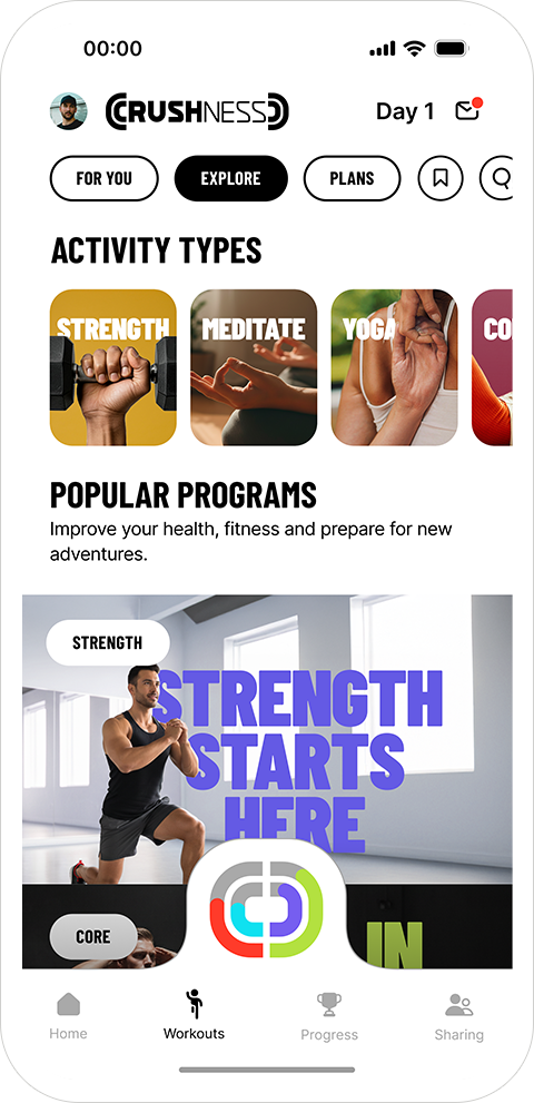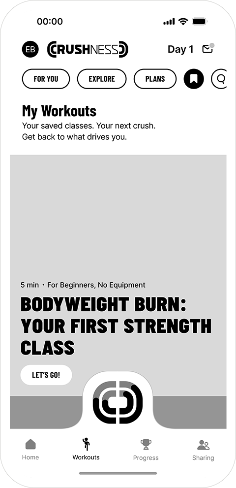 A multi-tab experience, For You, Explore, Plans, Saved, Search, designed to help users discover the right workout quickly without overwhelming them.