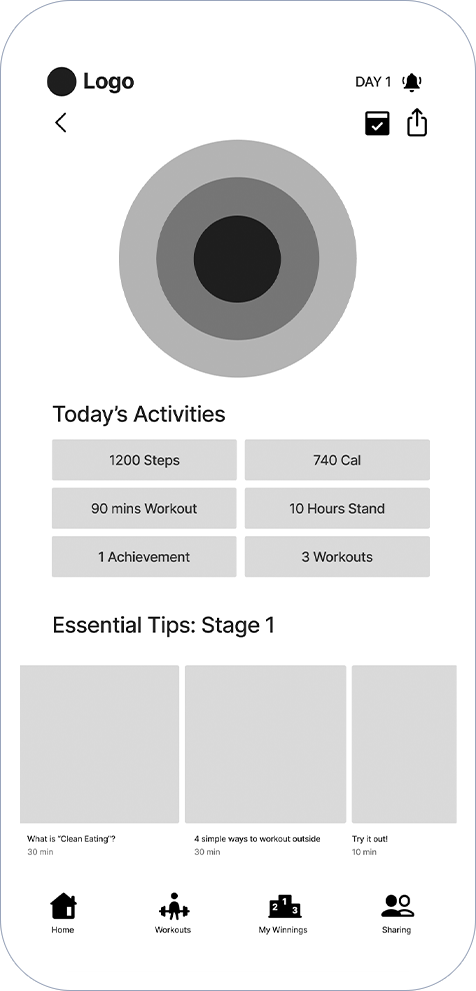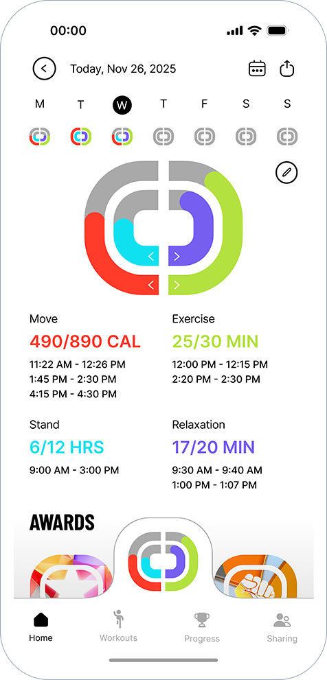 I designed a new visual system of four arches, a reinterpretation of Apple’s rings, appearing in the logo, the bottom navigation hub, and the Progress screens.